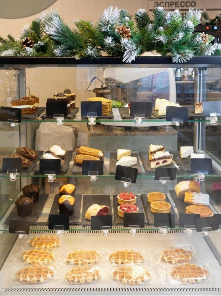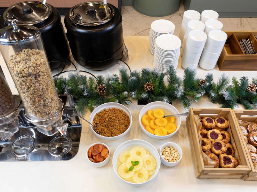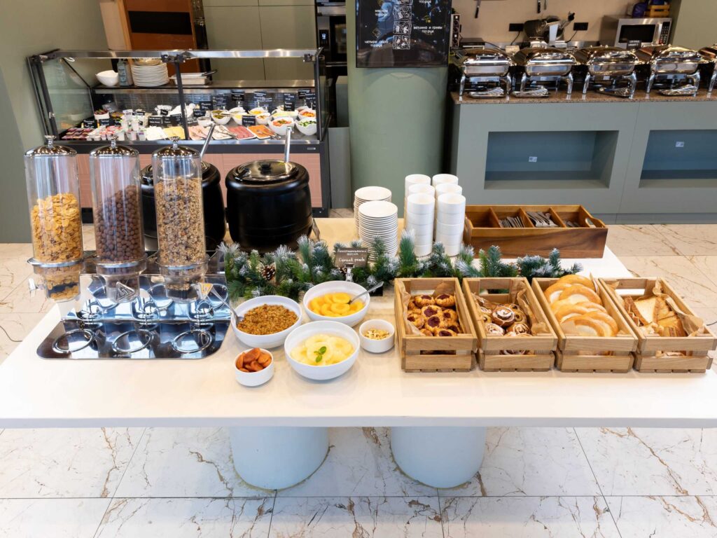 - Выпечка в ассортименте (мини-слойки с малиной или заварным кремом, мини-круассаны, кленовый-пекан, булочки синнабон)