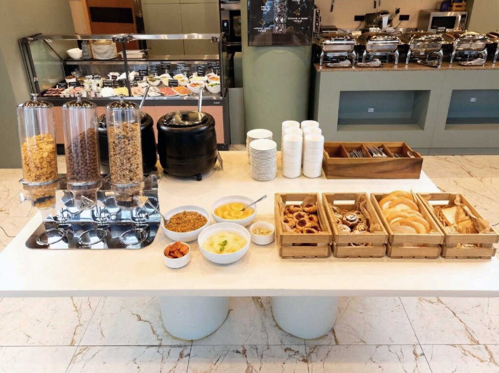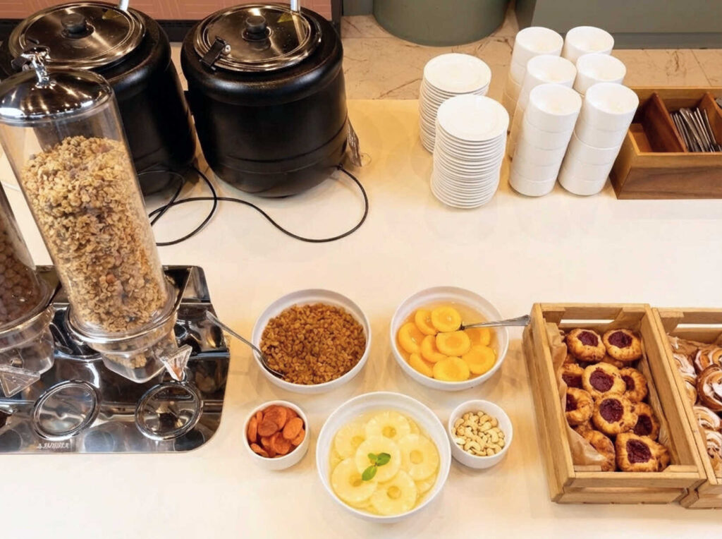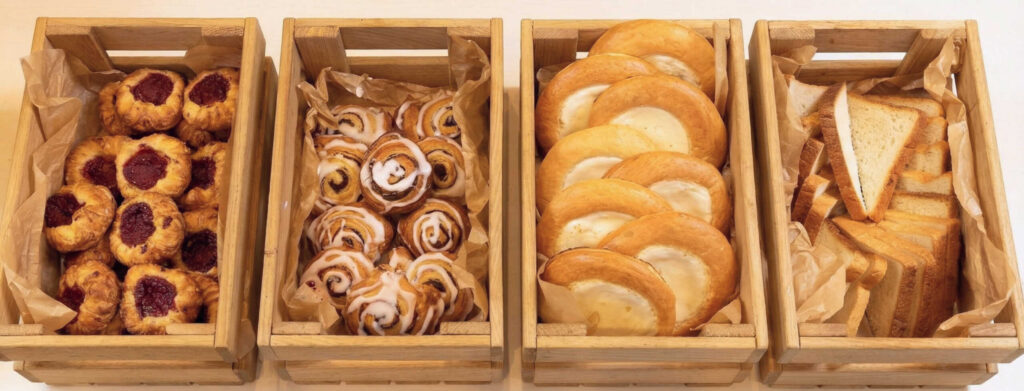 - Выпечка в ассортименте (мини-слойки с малиной или заварным кремом, мини-круассаны, кленовый-пекан, булочки синнабон)