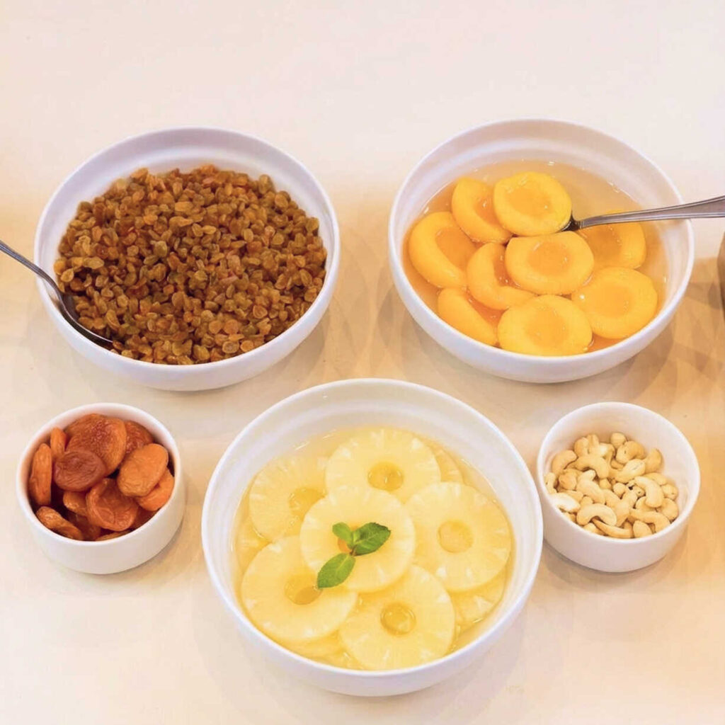 - Фрукты свежие и консервированные (персик, груша, фруктовый салат)