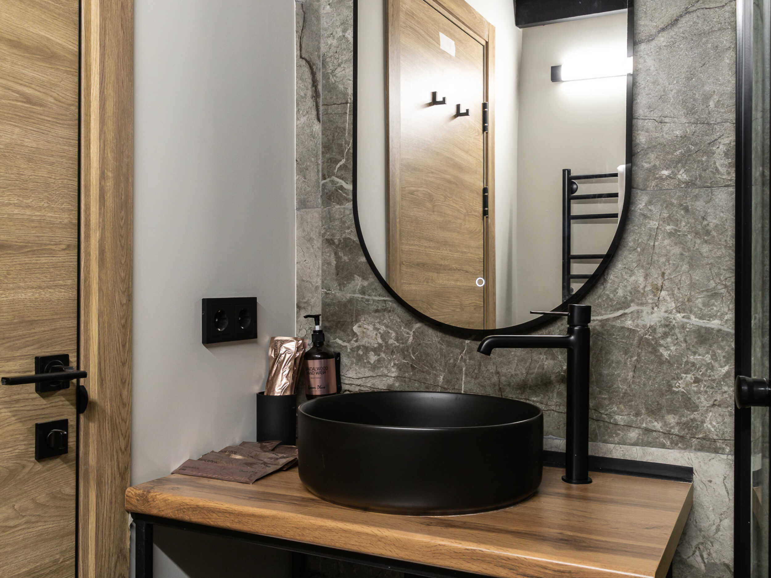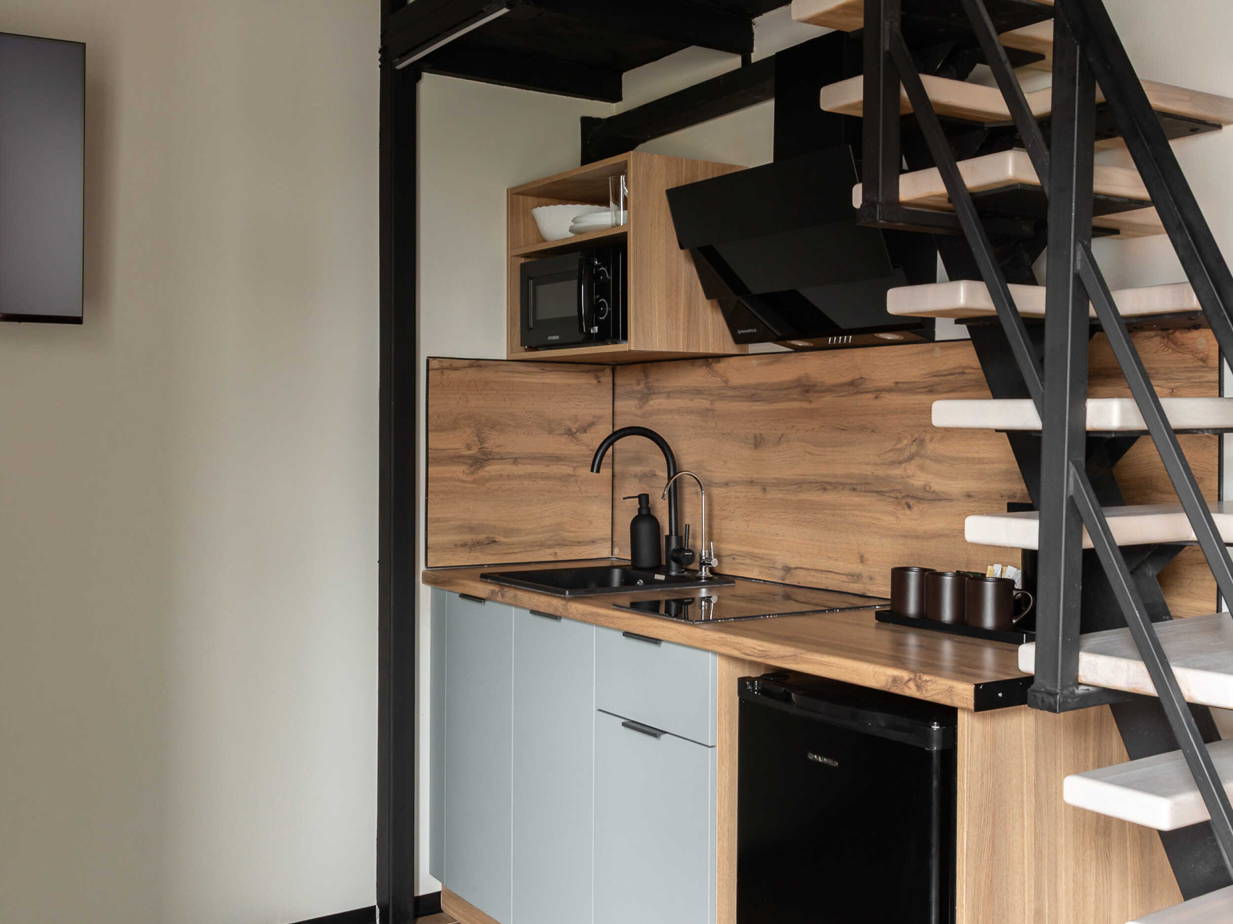 Современные апартаменты с увеличенной площадью и стильным интерьером. Первый этаж — гостиная и кухня, второй — уютная спальня. Отличный выбор для длительного проживания или романтического уикенда.